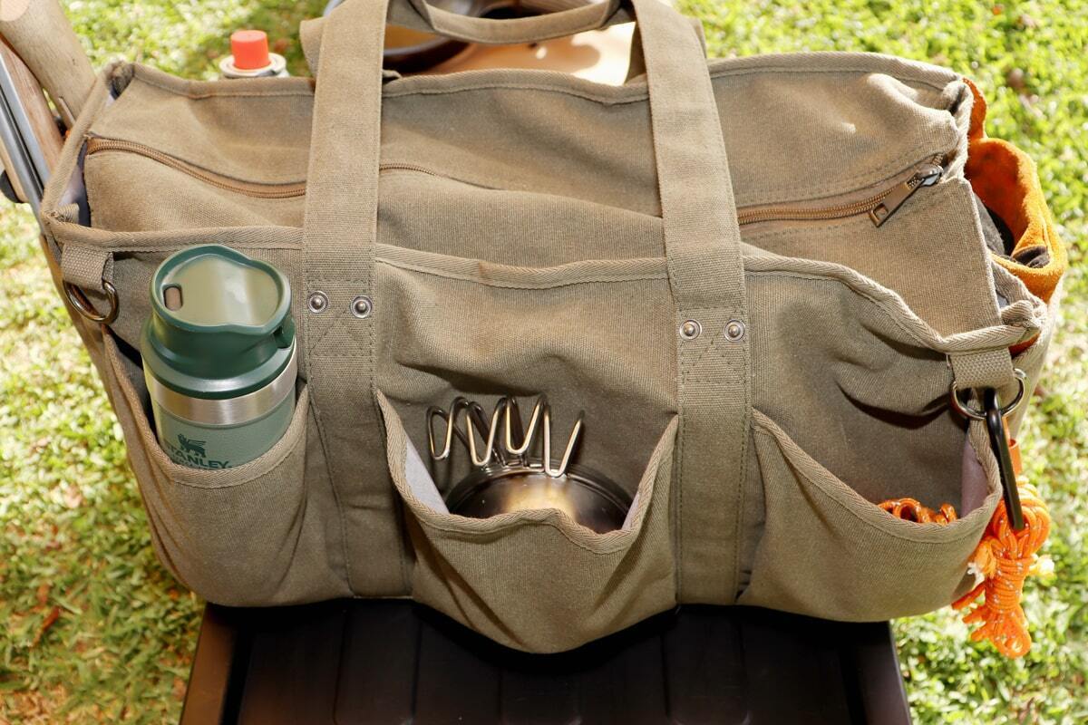 ただ収納力があるだけでなく、ガス缶や保温ボトル、シェラカップや焚火道具など持運びしにくい形状の道具をまとめて収納できるバッグなんです。