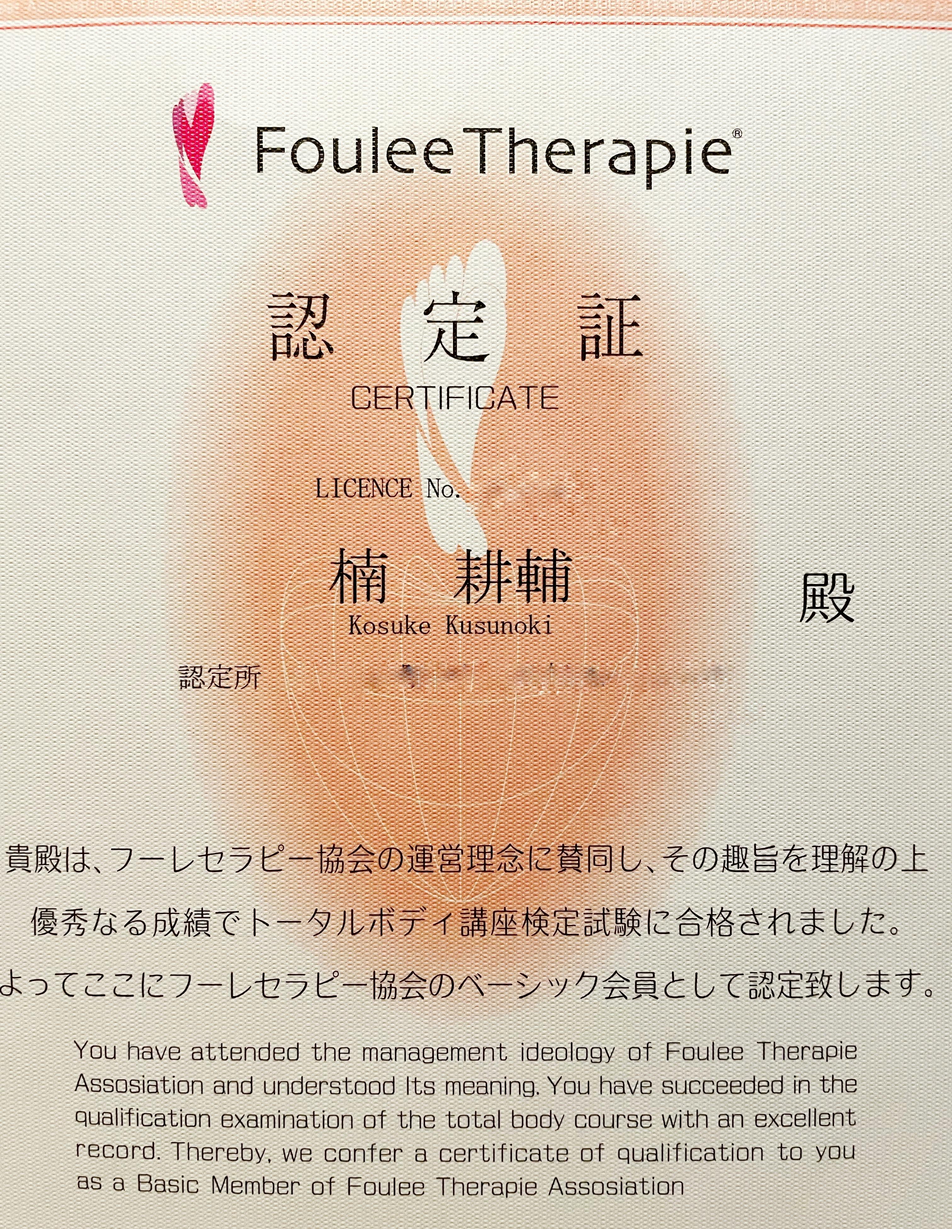 4年前にフーレセラピーアカデミーという学校に通い、資格を取得。