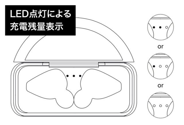 イヤホンケースのLEDランプが3つ点灯=75〜100%充電、2つ点灯=25〜75%充電、1つ点灯=25%以下充電、消えていると充電オフとなり、残量も分かる仕様になっています。