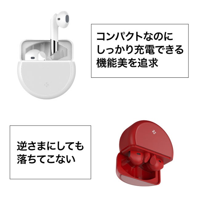 磁気テクノロジーでイヤホンケースにピッタリと収納することができ、抜け落ちることはありません。また、不要なボタンなどを搭載する必要がなくなったため、大容量バッテリーでありながらコンパクトなサイズを実現することができました。