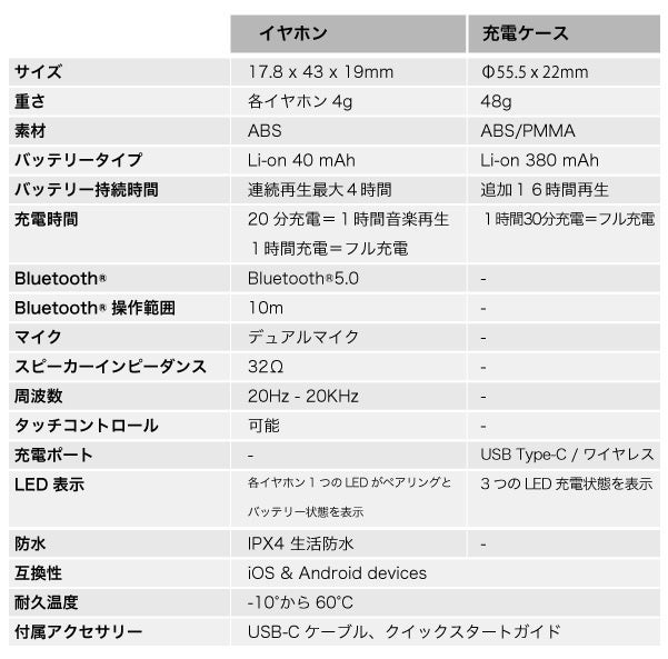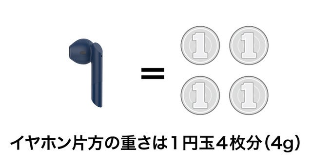 超軽量化設計で、イヤホン片方の重さはたったの4g!長時間の着用でも疲れにくく、耳への負担を軽くします。