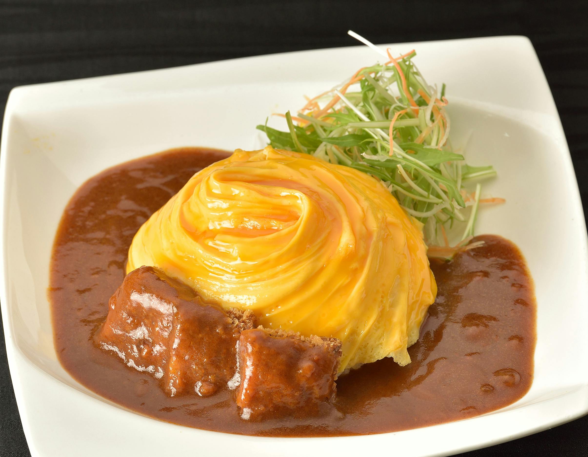 ドレス風オムレツを乗せた、「オムかつライス」も人気。