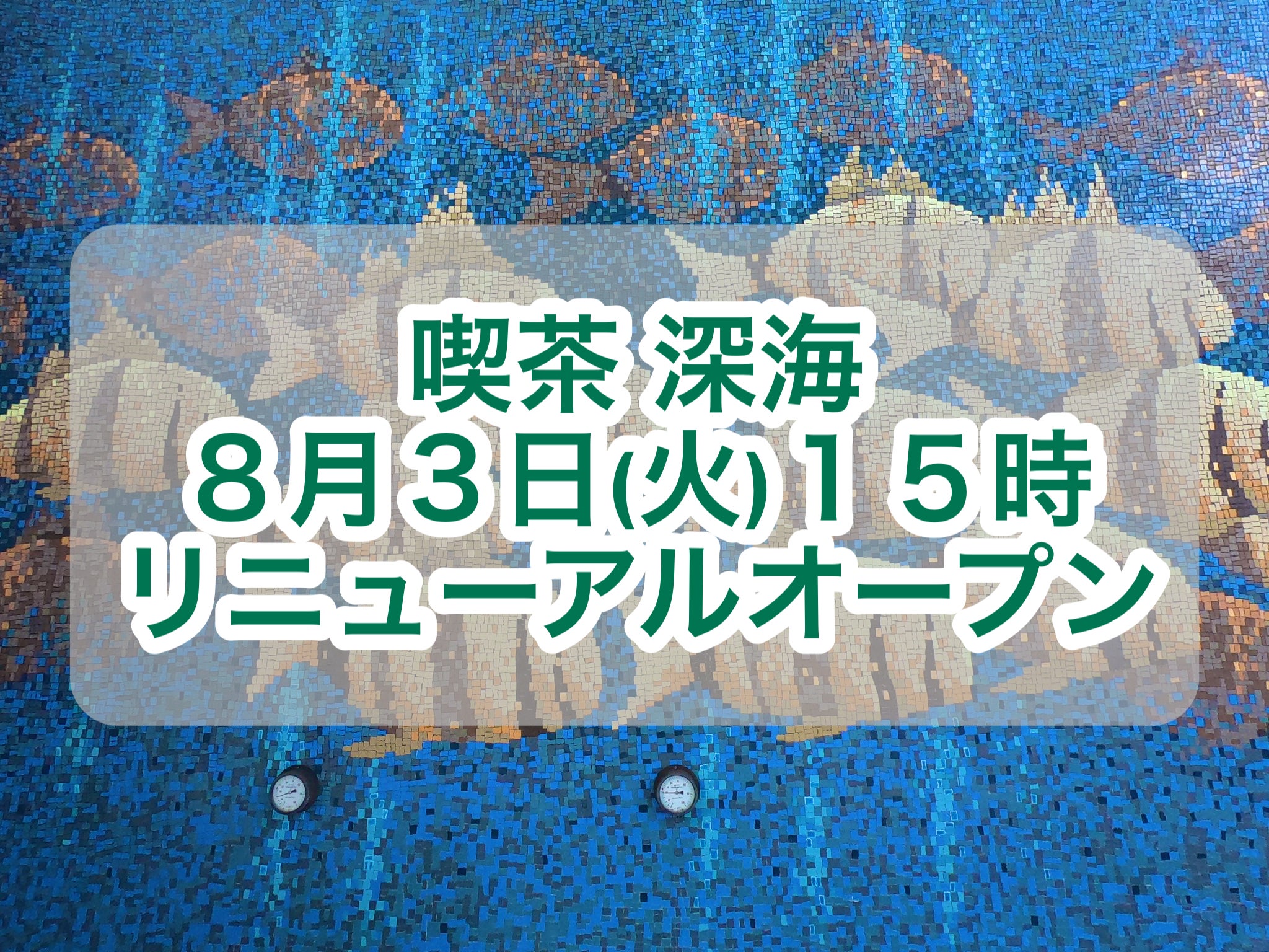 2021/07/28 21:24暑さの厳しい毎日が続いておりますが、皆さまいかがお過ごしでしょうか?お陰様で喫茶の改装工事は順調に進み、リニューアルオープン日が正式に決定致しましたのでお知らせ致します!2021年8月3日(火) 15時〜「喫茶 深海」リニューアルオープン!!!以前より人気のあったメニューに加えて、喫茶深海オリジナルメニューや銭湯併設ならではの工夫が詰まったもの等、新しいメニューが多数登場します!!!これまで無かった軽食も提供していく予定です♪メニューの詳細はまた後日お届けしますのでお楽しみに☆お風呂と併せて、もちろん喫茶店のみのご利用も大歓迎ですので、皆さま是非「喫茶 深海」の世界へ浸りにいらしてください!お待ちしております! もっと見る