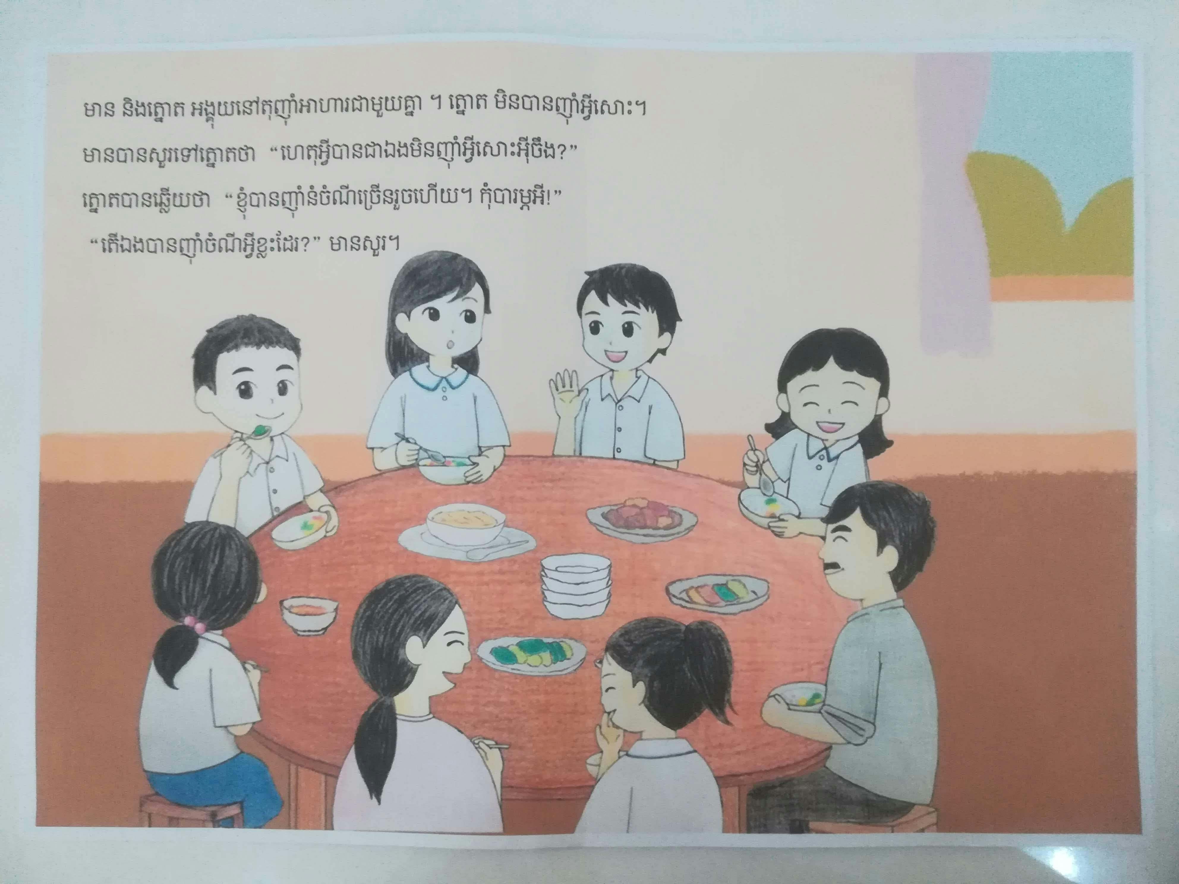 これまでの活動では、学校の先生方の理解を得て、通常の授業の時間を一部を借りるスタイルで行ってきました。これ自体、カンボジアの公立校においては、大変に新しい取り組みです。しかし、これでは時間的な制限や、対象となる子どもの数が限られること、子どもの食事に関与している保護者への働きかけが難しいことなどの課題もありました。そこで、伝えたい食育メッセージを絵本にして、子どもたちに配布し、自宅で保護者も一緒に何度も読み返せるようにしたいと考えるようになりました。