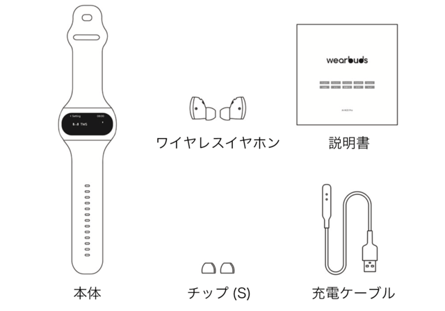 付属品:スマートウォッチ本体、ワイヤレスイヤホン、チップ(S)、充電ケーブル、説明書