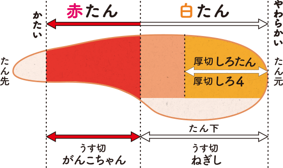 牛の舌の付け根の部分「たん元」がこの「白たん」と呼ばれます。あまり動かさない部位のためとても柔らかく脂がのる部位です。