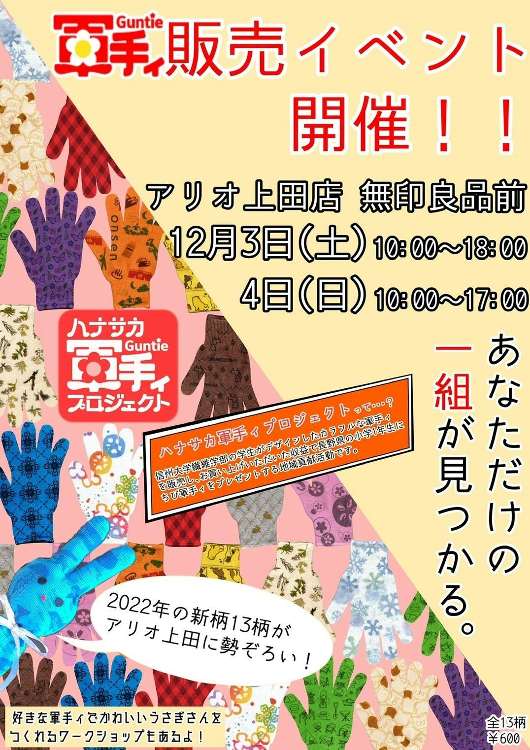 2022/11/21 23:01こんばんは!ハナサカ軍手ィプロジェクトです。長らく投稿が出来ておらず、申し訳ございませんでした。早いもので今年も「軍手ィ」が大活躍する季節がやってまいりました!先週11/19(土)からは長野県内の各販売協力店舗で今年の新柄13柄が販売開始されています。今年は例年とは違い、柄作成の際にメンバーでテーマを考えて作りました。動物柄、植物柄に加え温泉柄、キャンプ柄など今年ならではの柄もあります。そして、過去の定番のあの柄も復活しております・・・!!長野県内の方は是非店頭でお手にとってご覧いただけると幸いです。そして!!!!!今年もアリオ上田でイベントを開催します!!!!!今年も1年で1番大きなイベントが開催できること、非常に嬉しく思います。以下、詳細になります。日時; 12月3日(土)10:00~18:00 12月4日(日)10:00~17:00場所; アリオ上田店 1F無印良品前皆様にお買い上げ頂いた収益が今年も「ちび軍手ィ」となり、長野県内の小学1年生の手に届きます。このように14年目の今も活動が続いているのは応援して下さる皆様のお陰です。本当にありがとうございます。収益でより多くの「ちび軍手ィ」配布の機会に繋がることはもちろんですが、このような時代に対面でお客様と直接関わり、日頃の感謝をお伝えできることをとても楽しみにしております。メンバー一同お待ちしております!また、クラウドファンディングのリターンにつきましても今年12月で完了となります。長いようであっという間のプロジェクトでした。来月また改めてご挨拶させていただきます。寒くなってきましたが、「軍手ィ」をお持ちの方はぜひ身につけて暖かくしてお過ごし下さい。「軍手ィ」活用シーンのSNS投稿もお待ちしております!今後とも当団体をよろしくお願い致します。 もっと見る