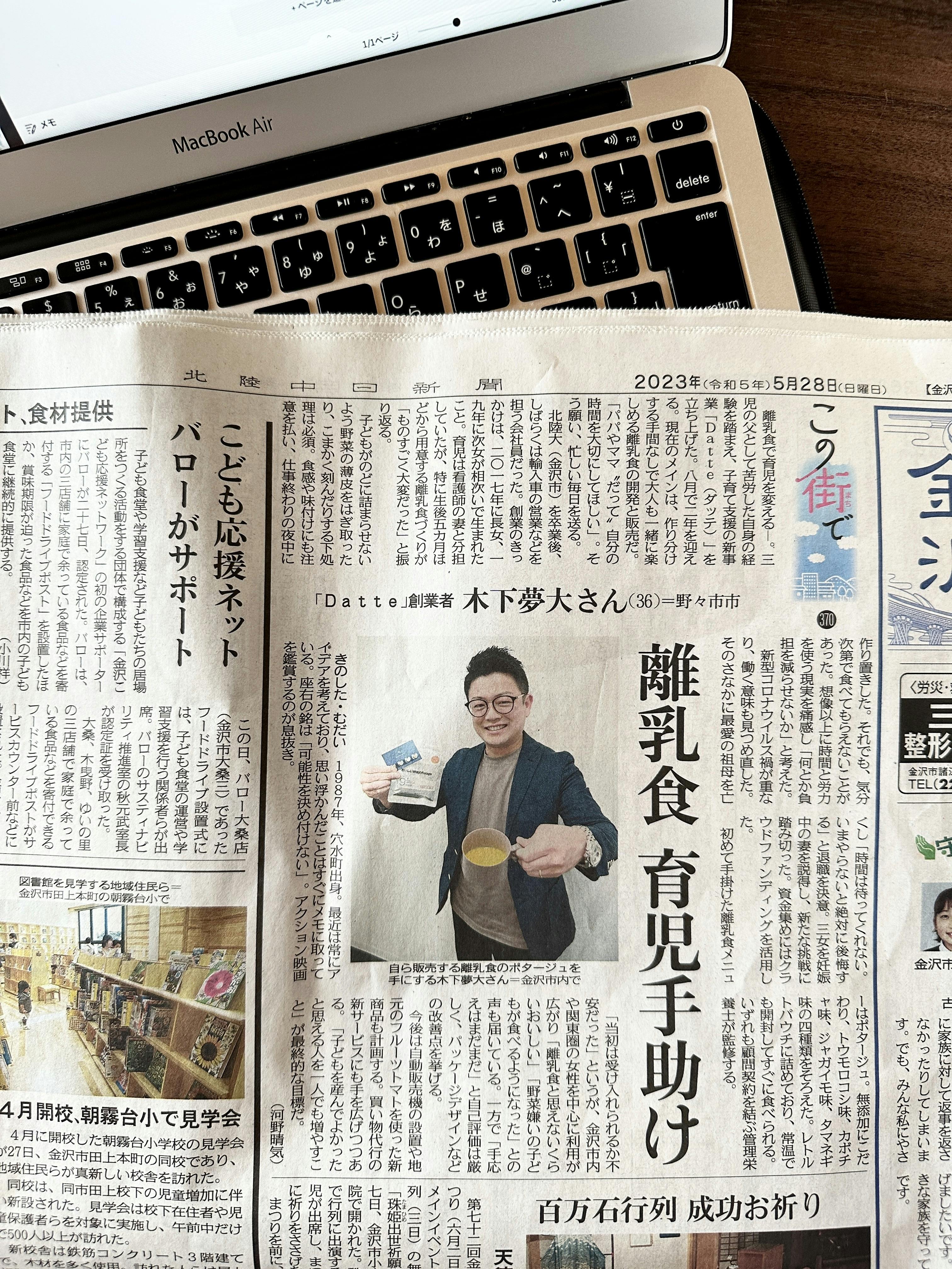 2023/05/28 12:39こんにちは。離乳食のDatteでございます。この度、2023年5月28日(日)付の北陸中日新聞にて当店が紹介されました。とても嬉しいです!ありがとうございます。気がつけば、創業してまもなく2年を迎え、オンラインショップをオープンしてから1年を経過しました。0からスタートし、無我夢中でここまできました(まだ無我夢中の最中ですが。笑)これも、クラウドファンディングでご支援くださった方々のおかげです。この場をお借りして改めてお礼申し上げます。離乳食のDatteは、これからも、1回でも多くの、そして1人でも多くのママやパパの「ホッ」をご提供できるよう努めてまいります。今後とも、末永くご指導とご愛顧のほど、どうぞよろしくお願い申し上げます。育児をもっと自由に もっとわがままに離乳食のDatteDropever 代表 木下夢大 もっと見る