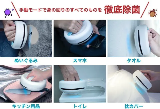 ドアノブ、枕カバー、衣類、スマホ、キーボード、腕時計、キッチン用品、照明スイッチ、眼鏡、バスルームの備品、おもちゃ、テレビのリモコンなどあらゆる表面を除菌することができます。