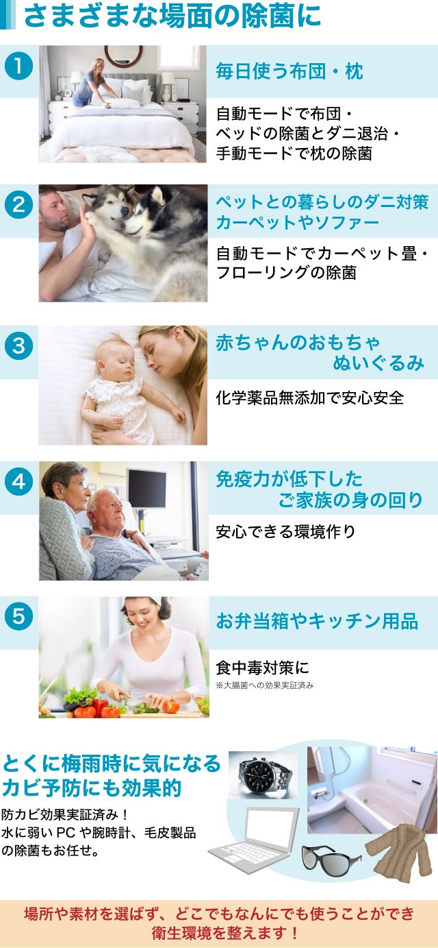除菌、というと「大変」「面倒くさい」「不安」などとマイナスのイメージを持たれがちですが、この除菌ロボットはそのマイナスのイメージを覆す、「ボタン1つで楽々」そして「音楽を聞きながら楽しく」できる特徴があります。さらにエビデンスがきちんと出ており、除菌効果・ダニ駆除効果が認められています。