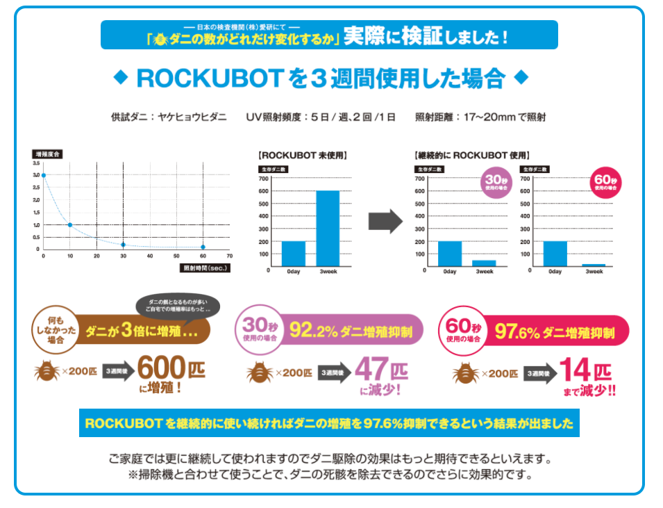 2021/07/29 09:00皆様こんにちは!温かいご支援、誠にありがとうございます。約1か月に及ぶプロジェクトも明日23:59で終了となります。ウイルス対策が気になる毎日であることはもちろんなのですが、最近、ダニについて多くのお問い合わせを頂くので簡単にまとめさせて頂きます。畳にも使えますか?という質問を頂きましたが、もちろんお使い頂けます!!(コンパクトサイズのロボなので、お部屋全体をするにはある程度お時間はかかりますが)除菌ロボROCKUBOT、ダニに対する効果検証は(株)愛研様に依頼して検証してもらっています。約3週間の検証で、ヤケヒョウヒダニについてどれだけ効果があるのか調べました。【検査方法】それぞれ200匹のダニに対して①一つはなにもしない②もう一つは毎日除菌ロボを使用除菌ロボを未使用の媒体①は、なんと3週間で600匹までダニが増えました(恐ろしい・・・)一方毎日使用した②の媒体は、200匹のダニが14匹まで減少したという結果が出ました。つまりダニの増殖抑制効果は97.6%。何もしなければ3週間で3倍に増えるという驚異のダニの増え方にも驚きました。ダニの主食は、髪の毛やフケ、アカ、食べカスなど、このようなエサが豊富にあるご家庭では増殖スピードはもっとすごいものになるかと予想されます。布団を干すのは大変な作業ですよね・・・またベッドのマットレスのケアもまた悩むところだと思います。除菌ロボROCKUBOTのUVCは太陽光の1600倍の力があります。お布団を干すより、断然ダニ対策の効果があります。そして何より、ボタン一つで全自動で動いてくれるので楽々布団ケアができるのです。40分で自動停止機能もついておりますので、お出かけ前にピッとボタンを押していけば、除菌されたお布団で寝ることができます。(目安はシングルサイズで約20分)天気も時間も気にせずに、ダニ対策はぜひROCKUBOTにお任せください!一つ注意点は、1回(短期間)の使用ではあまり効果がわからないと思いますので、継続的にご使用くださいませ。毎日でなくても大丈夫ですので、定期的な使用をおすすめします。また吸引機能はついておりませんので、ダニの死骸が気になる方はコロコロや掃除機などをご利用ください。ダニアレルギーなどがない方、ダニを死滅させるだけでも十分お布団ケアとしては意味があることだと思います。化学薬品を使わないダニ対策、ぜひ試して頂きたいと思います。長くなり申し訳ございません。最後までどうぞ温かいご支援、よろしくお願い致します。株式会社EGLOKINAWA 物販プロジェクトチームマネージャー もっと見る