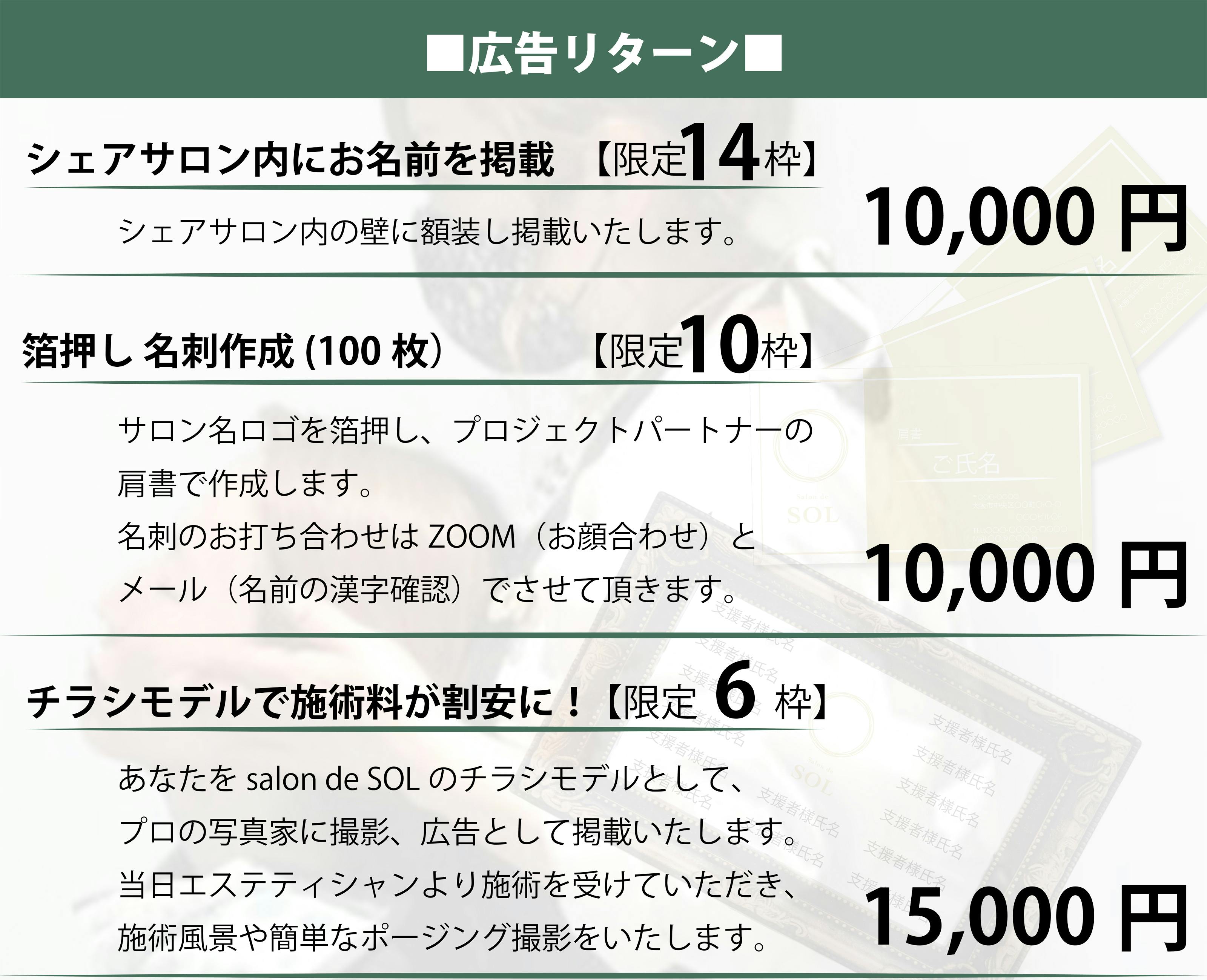 クラウドファンディングの資金は、美容施術者様にとってより良いシェアサロン、お客様にとってより使いやすい、またここで癒されたいと思って頂けるシェアサロンにしていくために、サロン内備品の購入、運営費用、広告料に充てさせて頂きます。