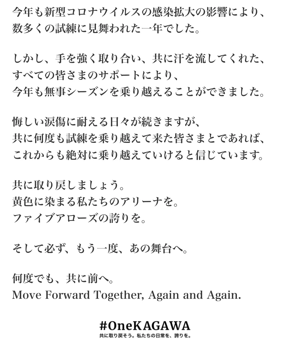 ぜひ #OneKAGAWA チャリティーユニフォームの購入を通して、#OneKAGAWA PROJECT の仲間になっていただき、黄色く染まるアリーナを、香川ファイブアローズの誇りを取り戻すために、共に戦いましょう。