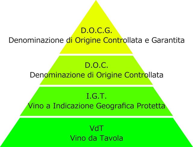 イタリアでもフランス同様に4段階のワインの格付けがあり、ピラミッド型のようになっており、最上位に認定されているワインが少なく、下の等級になるにつれて認定されているワインが多くなっています。