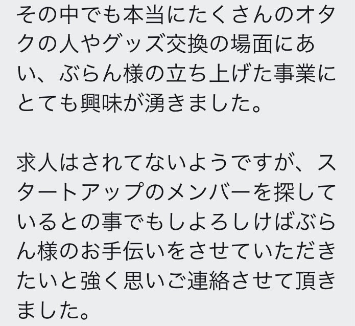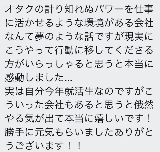 オタクの期待と夢を背負い、1日も早く会社を成長させ、たくさんのオタクたちとより良いオタク社会を目指し楽しく働ける未来のために尽力してまいります。
