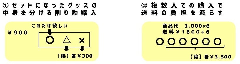 ①は、セットになったグッズの中で、推しだけ欲しい(集めたい)方が、その他のメンバーやキャラクターが欲しい方を探し、みんなで1つのグッズを買う手法。