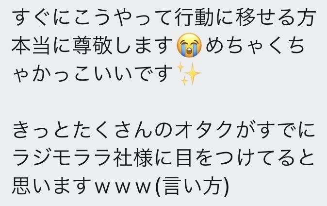 社内はもちろん、ラジモララに関わる全ての方に幸せが連鎖するような八方よし運営を心がけていきます!