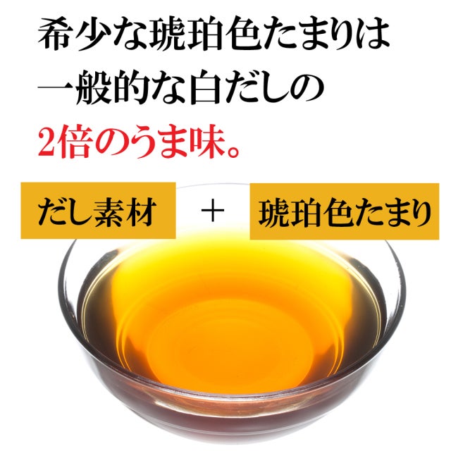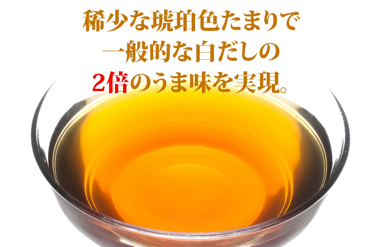 そこで従来品の不満を改善した白だしづくりに挑戦しました。色々調べた結果、うま味(※1)が強く塩味を抑えた色の淡いたまり醤油「琥珀色たまり」があることがわかり白醤油もしくは薄口醤油と置き換えることにしました。20種類以上の天然のアミノ酸が含まれ深みのあるまろやかな味わい。生産量が醤油全体の2%程度と希少なたまり醤油の中でさらに生産量の少ない幻の逸品です。