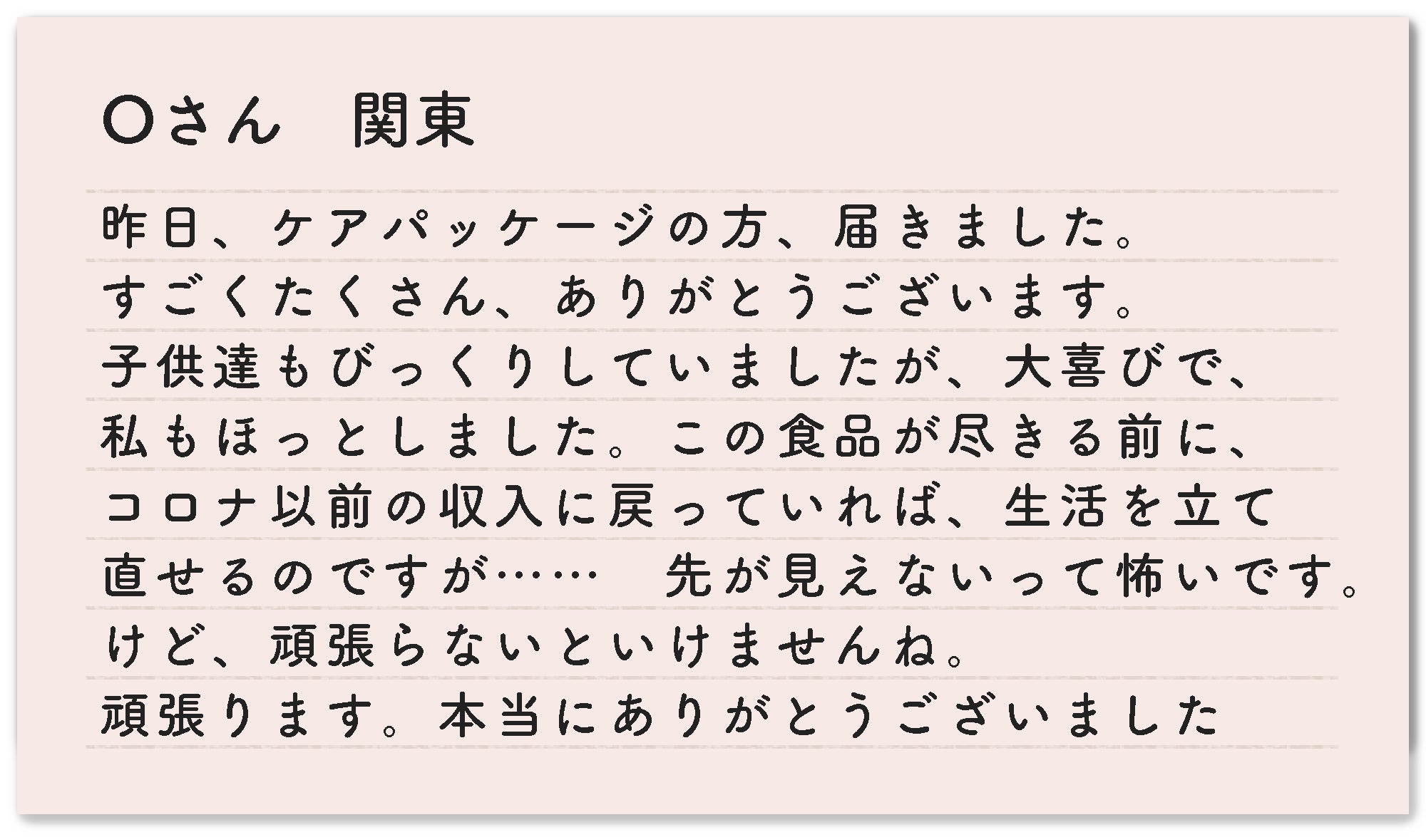 私たちの支援活動は、生活に困窮している方々の根本的な解決にはなりません。しかし、ケアパッケージを受け取られる方々が、少しでも慰められ、励まされ、頑張ってみようという思いが与えられることを願って活動しています。