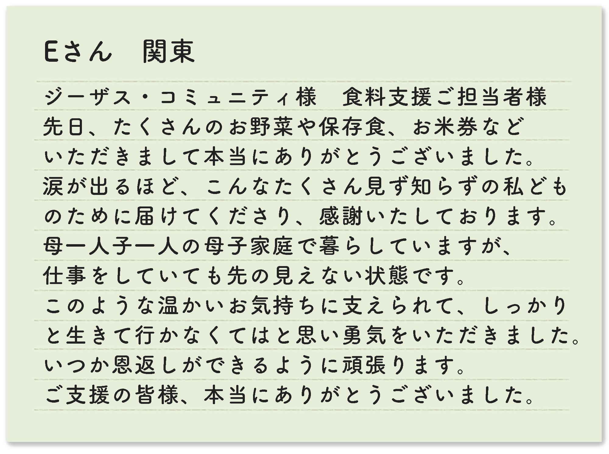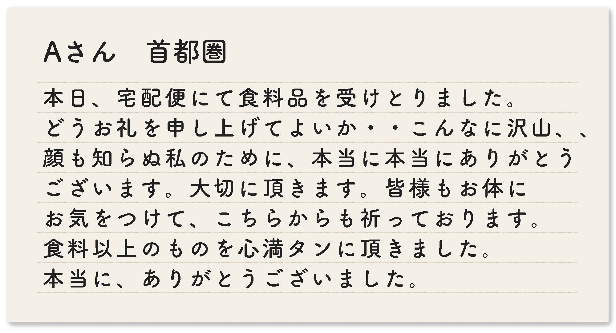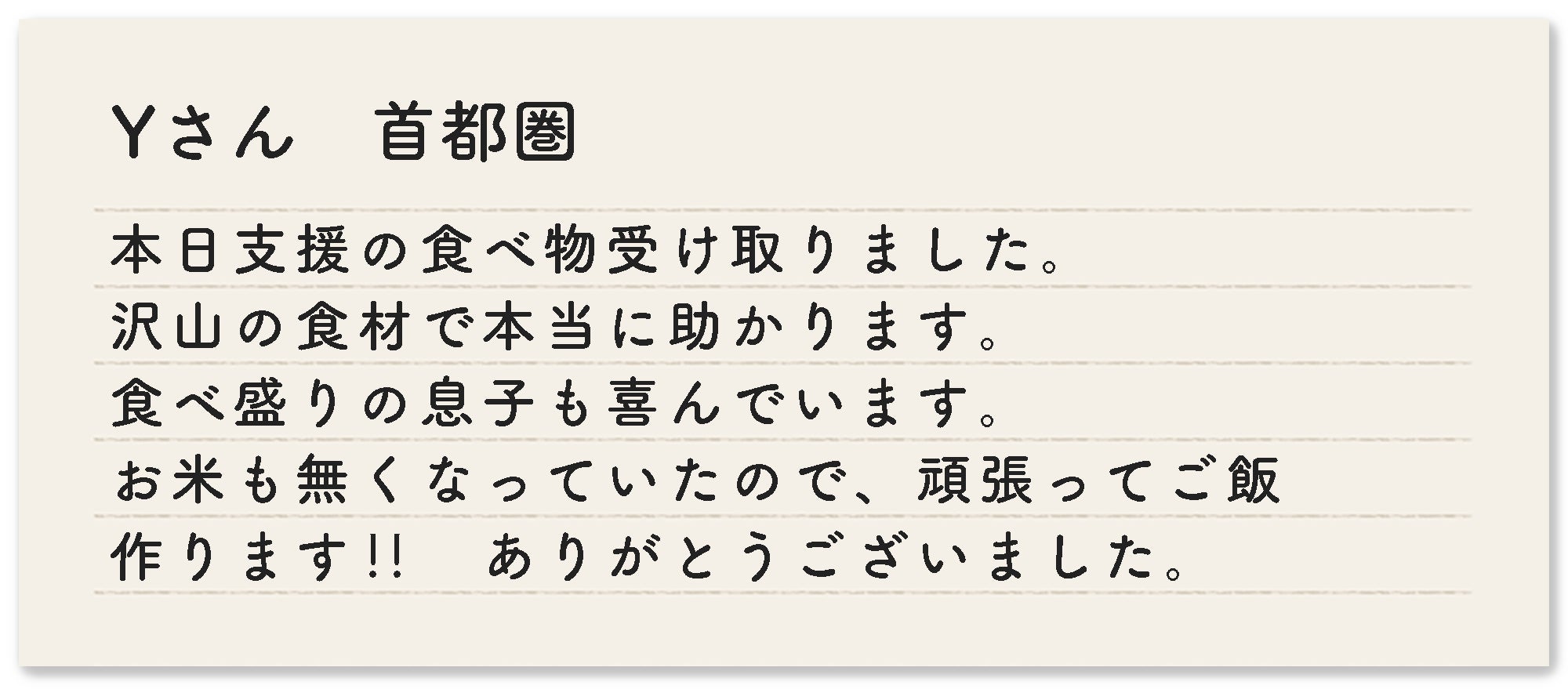 私の地域ではこのような取り組みをしていただいているところがなく、近隣とは言い難いのですが藁をも掴む気持ちで申し込みをしてみました。コロナ禍で収入が激減し、毎月借金を増やしながら何とか子どもたちを育てています。正直、月々の支払いすら足りず食費など一銭もない状態が続いています。もしよろしければ助けていただけないでしょうか。