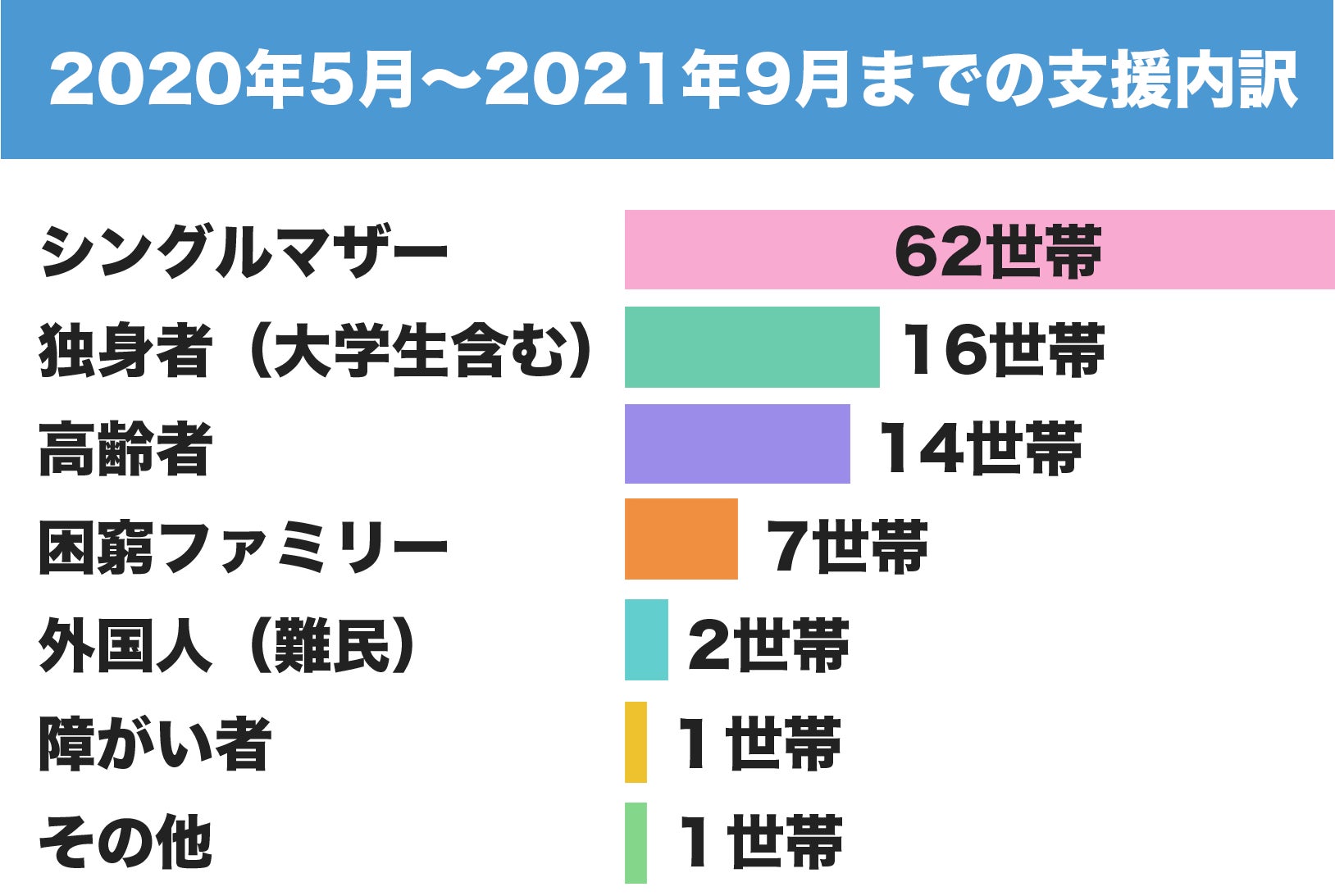最初は、シングルマザーを対象に支援を始め、去年 5月から今まで(2021年9月現在)100世帯以上に、食料品を詰めたケアパッケージ(1〜2万円)を無償でお届けしてきました。