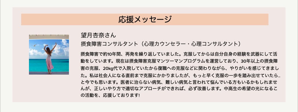 摂食障害は重大な精神疾患であるにもかかわらず、社会の理解や支援体制は十分とは言えません。私自身、学生の身だったので自分の意思で支援を受けるにも限界があり、一人で苦しむこともありました。もっと、いろんな『繋がり』があればと思いこのプロジェクトを企画しました。このプロジェクトを通して、摂食障害への正しい知識を広めていくこと、当事者が安心・安全を感じられるような場所作りができたらと思っています。