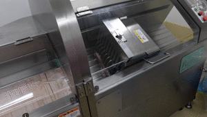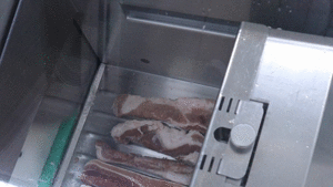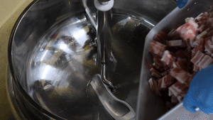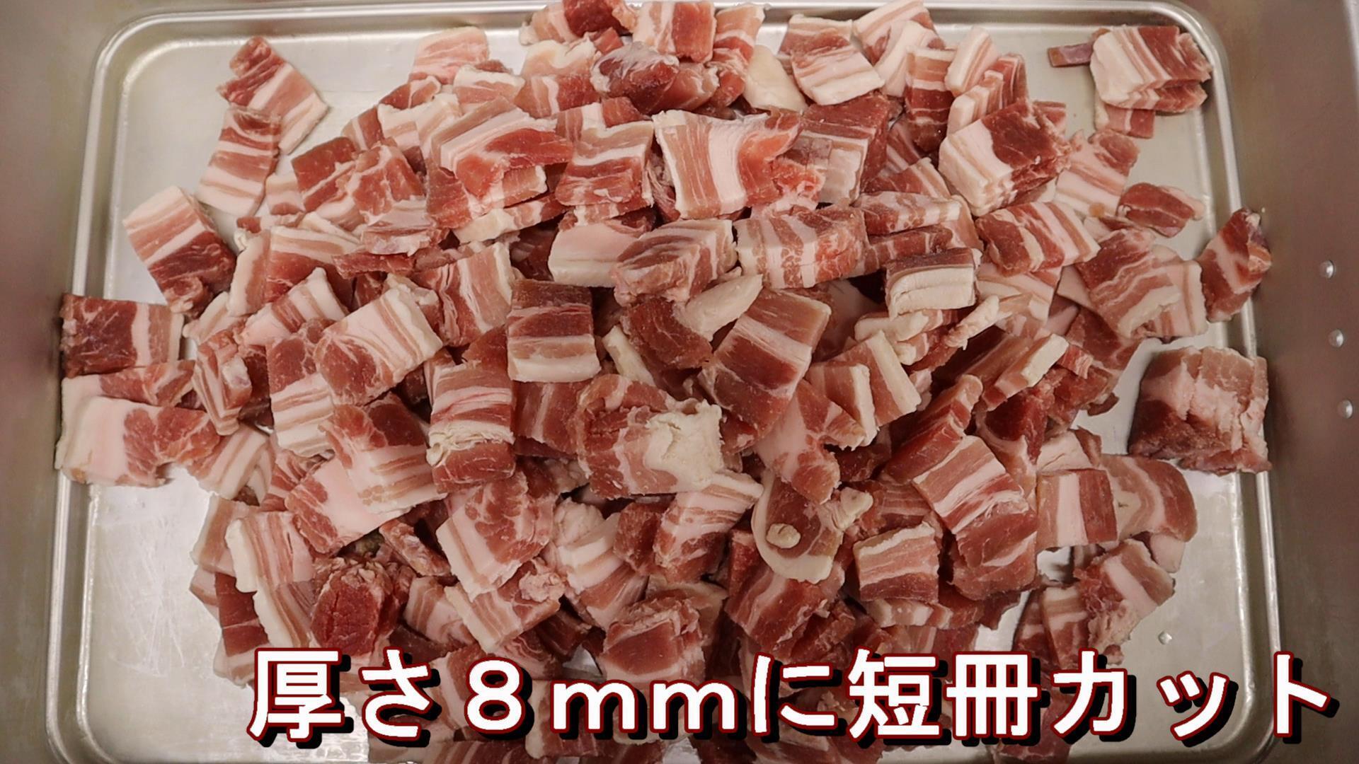 豚バラ肉の端材をカットの機械で、厚さ8mmの短冊カット