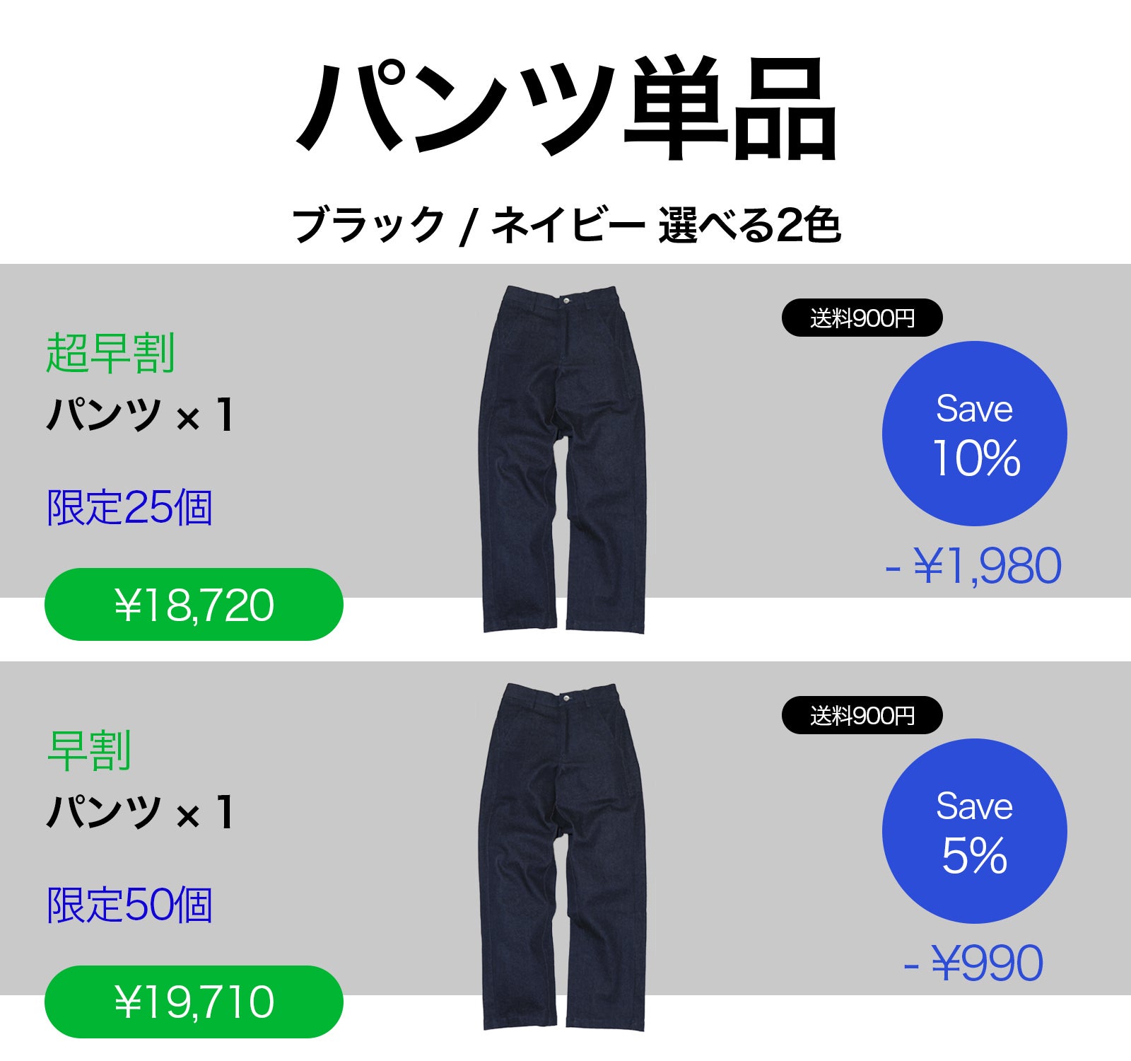 日頃、ヘビロテで履くデニムパンツだからこそ、お得な「パンツセット割」をご用意しています!