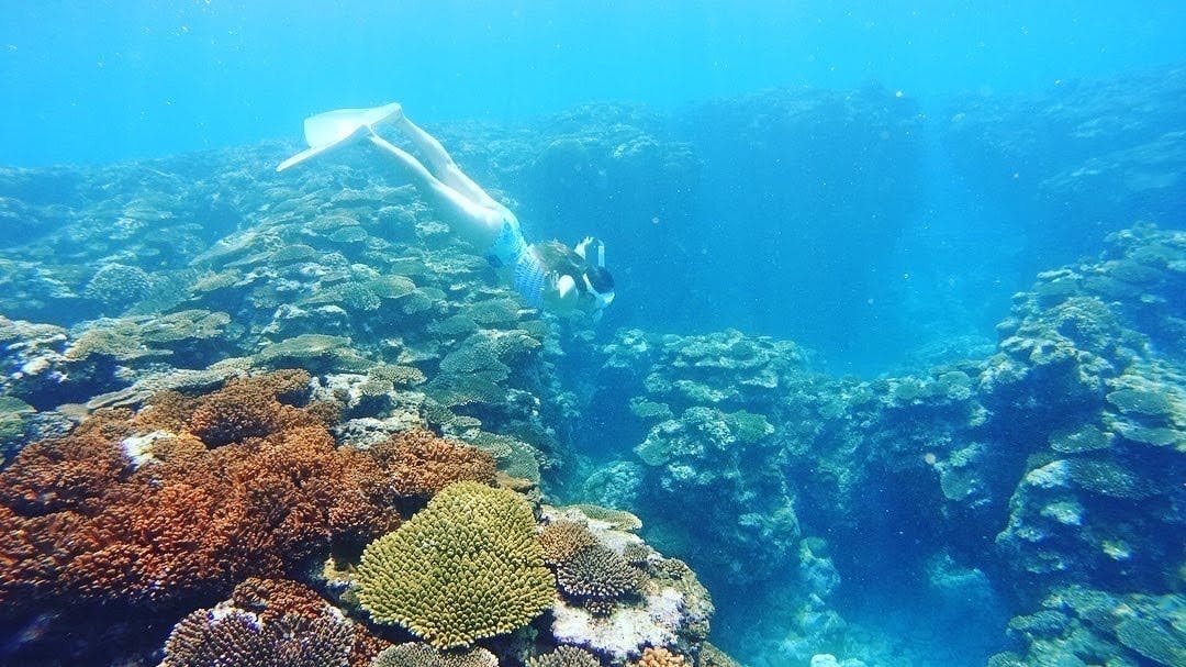 透明度の高い深さ8m超の外海は海底まで透き通って見えます、深さ2mのエリアまでをメインのシュノーケリングで楽しみます、美しい珊瑚畑と熱帯魚を間近に見る事ができます。