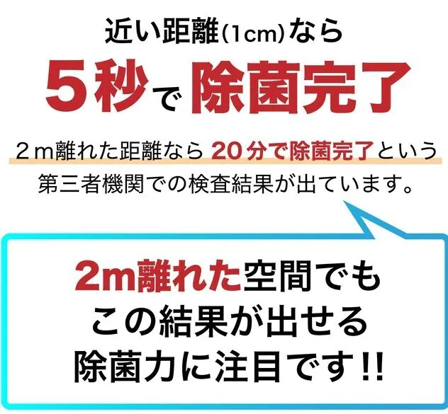 A, はい、第三者機関によって証明されたテスト結果があります。近い距離だけでなく、2m離れた距離でも除菌できるという結果は他の製品ではあまり示されていない結果かと思います。