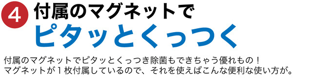 2m離れた場所でもこれだけの除菌力が発揮できる機能、マグネットでくっつけるという新しい発想、そして特許を取得しているスタイリッシュなデザインにも魅力を感じました。