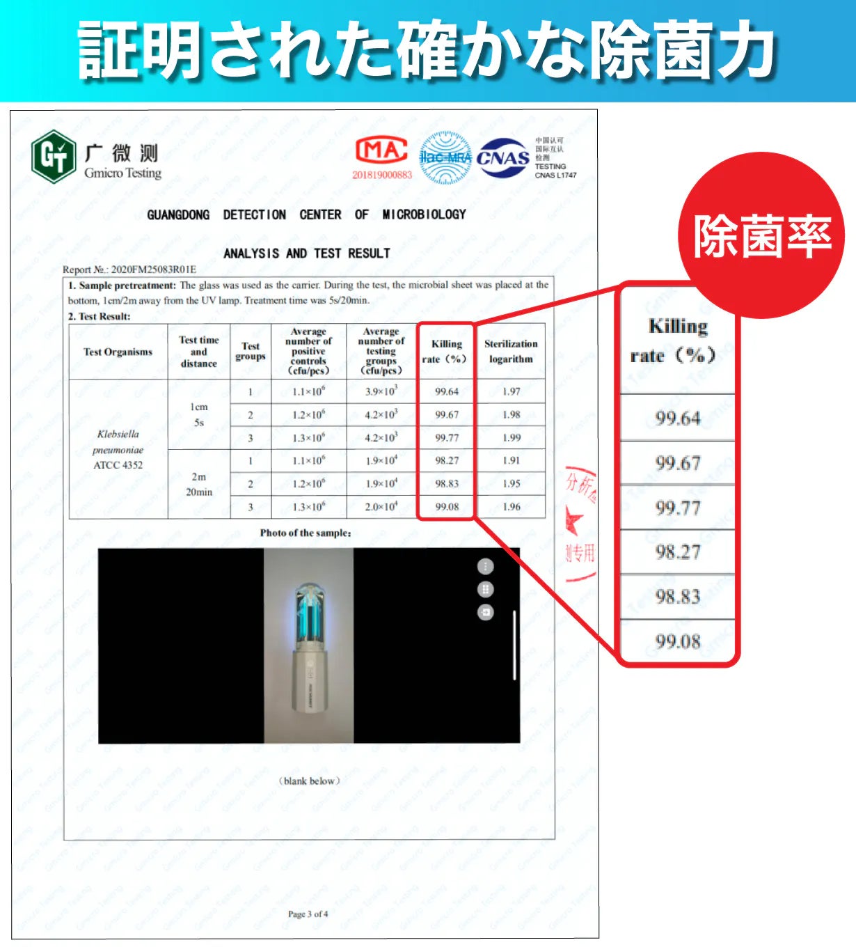 A, はい、第三者機関によって証明されたテスト結果があります。近い距離だけでなく、2m離れた距離でも除菌できるという結果は他の製品ではあまり示されていない結果かと思います。