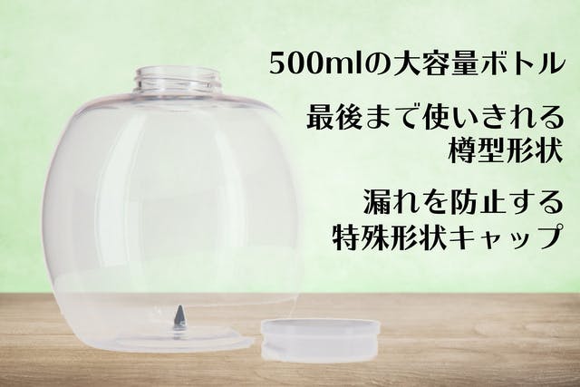 ボトルの形状にもとことんこだわりました。四角形のボトルだと粘度の高いリンスなどはどうしても隅や端に残ってしまいやすい・・・可能な限り自然にシャンプーやリンスが出てくるよう行きついたのがこの樽型の形状です。重力落下式ですので最後までシャンプーやリンスを無駄なく使えます。