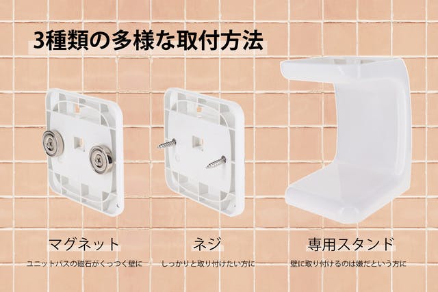 浴室壁面への取付方法も、日本の様々なご家庭のバスルームに合わせて3通りの設置方法を準備しました。タイルなどにしっかりと取り付けたい方にはネジで、ユニットバス等で磁石のくっつく壁にはネオジウム磁石を使った専用マグネットで、壁に穴はあけたくないという方にはSHAMDiを設置できる専用スタンドをご使用頂けます。(※マグネットを使用する際は、ご家庭のバスルームの壁に磁石がくっつくことを確認の上、必ず低い位置で設置テストを行ってからご使用ください。)