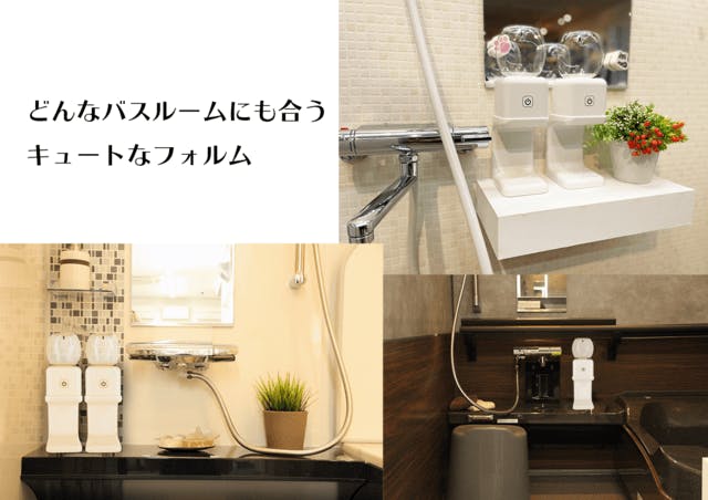 ボトルと立方体のキュートな形状。ホワイト色の本体はどんなバスルームにもフィットするキュートなデザインになっています。