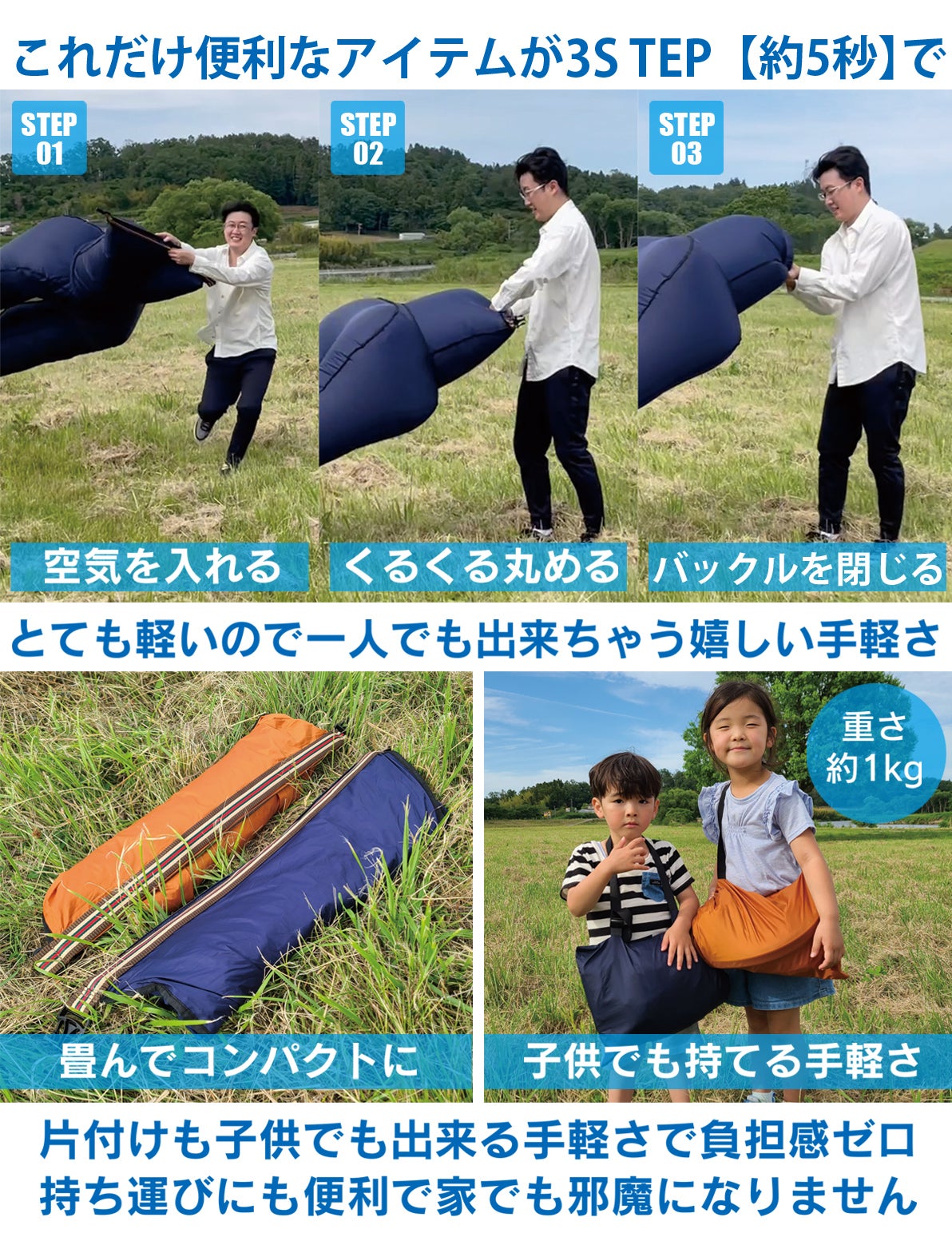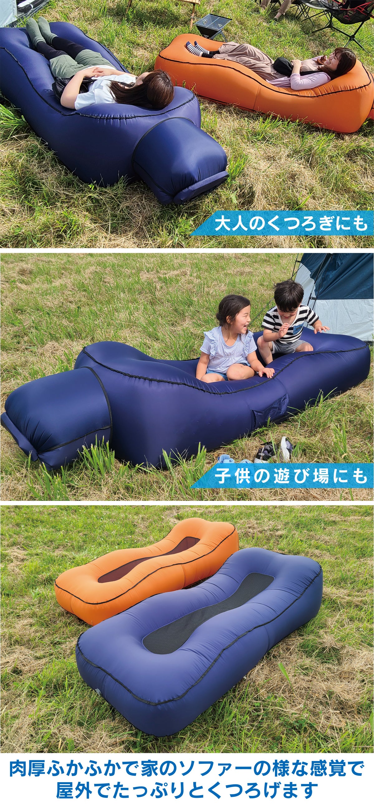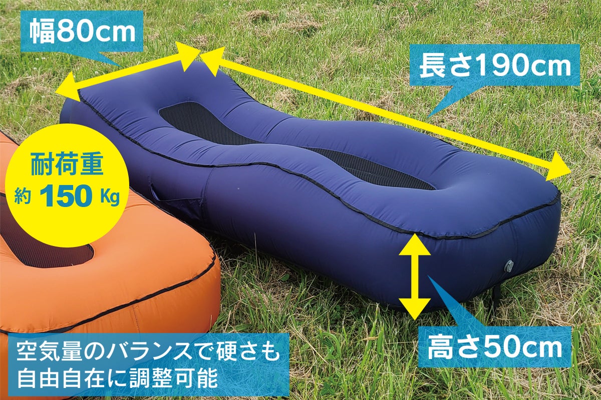 空気の多さによって硬さを調整できるベッドは、さらさらとした手触りが気持ちよく、いつでもどこでも手軽にくつろぐことができます。室内はもちろん、公園やキャンプ、プールや海でのレジャーにぴったりです。