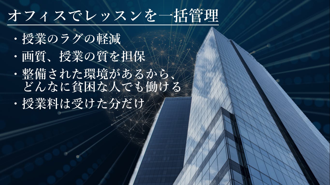 本事業では、これらの悩みを全て解決すべく、海外の英会話教室でよく行われている【リプロダクショントレーニング】を日本人向けに再構築しました!さらに、全授業はビジネスオフィスで統括され、光ファイバーを用いた環境で展開されるため、ラグや画質等における問題もほとんどなく、音声品質も従来より格段に向上します。しかも、授業料は授業を受けた分だけ支払う仕組みなので、無駄はありません!