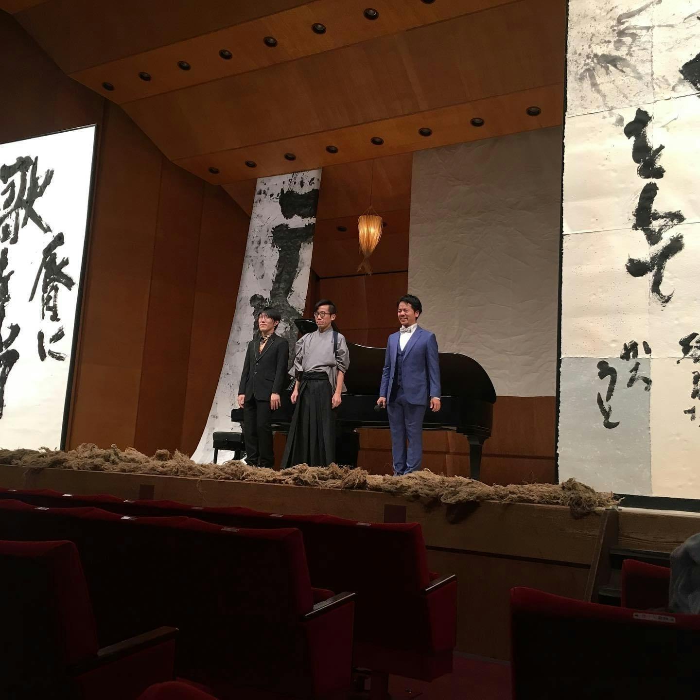 《音と言葉の間》はバリトン歌手・荒井雄貴、ピアニスト・新野見卓也、書家・小杉卓の3人による、書とクラシック音楽が融合した、新感覚クラシックライブパフォーマンスです。2018年より本格的に始動したこのパフォーマンスは、洋の東西・過去と現在が衝突したところに生まれる新しい表現の形を目指しています。