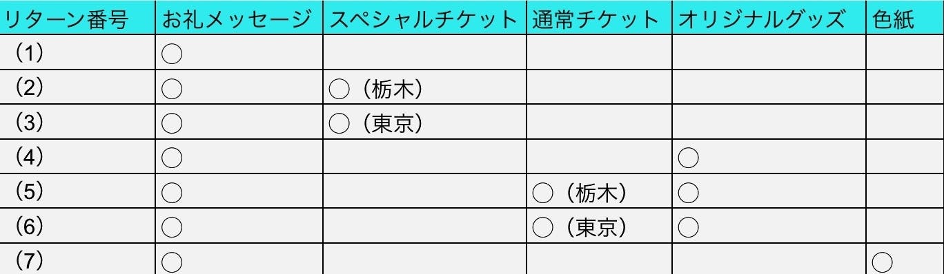20種類のリターンをご用意いたしました。具体的な内容につきましては、各リターンの詳細をご覧ください。リターン(5)と(6)に関しましては、チケットとグッズを別々にお求めいただくよりもお安くなっております。数量限定ですので、お早めにお申し込み下さい。