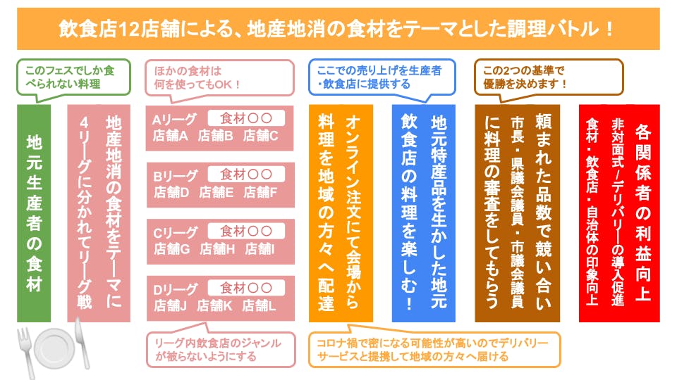 飲食の力で再び人々を笑顔にしたい!また、大変な状況にある飲食店の方々にも活躍してもらいたい!そんな思いから食フェスを開催することに!地元食材を使って地元の12店舗が壮絶な料理バトルを!!その模様は豪華ゲストによる臨場感たっぷりのライブ中継でお楽しみいただき、そして完全デリバリーであなたの手にっ…!!