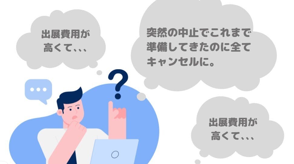 展示会は通常2~3か月、長いもので半年以上も前から出展の準備を行うことが通常ですが、感染症や災害など展示会が中止となった場合ビジネス機会が失われるどころかキャンセル料や準備にかかった費用まで背負うことになります。