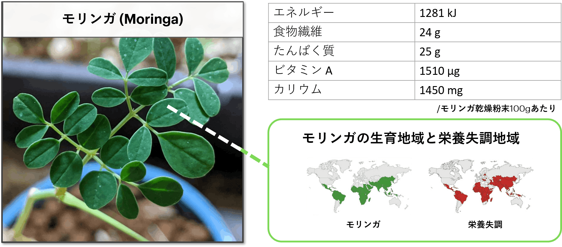 モリンガとは、亜熱帯以南の地域で育つ植物です。その高栄養価から、「奇跡の木」と言われているほど、今世界で注目を集めています。モリンガにはビタミンやミネラルをはじめとした栄養素がバランスよく、また一般食品と比べても高用量含まれています。モリンガ単一(1日摂取目安量:3g)でも幅広い栄養素を豊富に取れることから、「スーパーフード」と言われ、その価値は国連機関から子供の栄養状態改善に推奨されるほどです。また、栄養素だけではなく、多くのCO2を吸収することで環境問題にも寄与すると言われています。