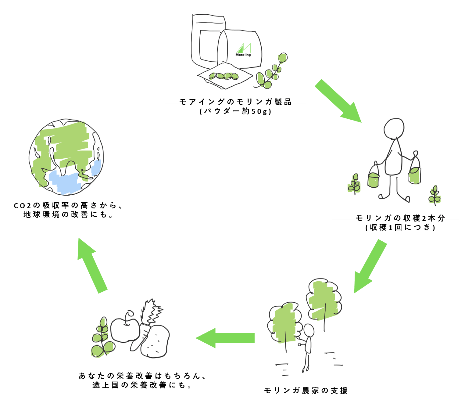 この問題を解決するために、More-ing(モアイング)というプロジェクトが立ち上がりました。モアイングは、モリンガの生産量と消費量を増やすことで、現地の経済状況の改善から栄養状況の改善を目指します。