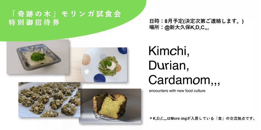 10000円以上ご支援いただいた方には、8月上旬から中旬に新大久保K,D,C,,,***で開催予定の「「奇跡の木」モリンガ試食会@東京」特別御招待券をお送りいたします!