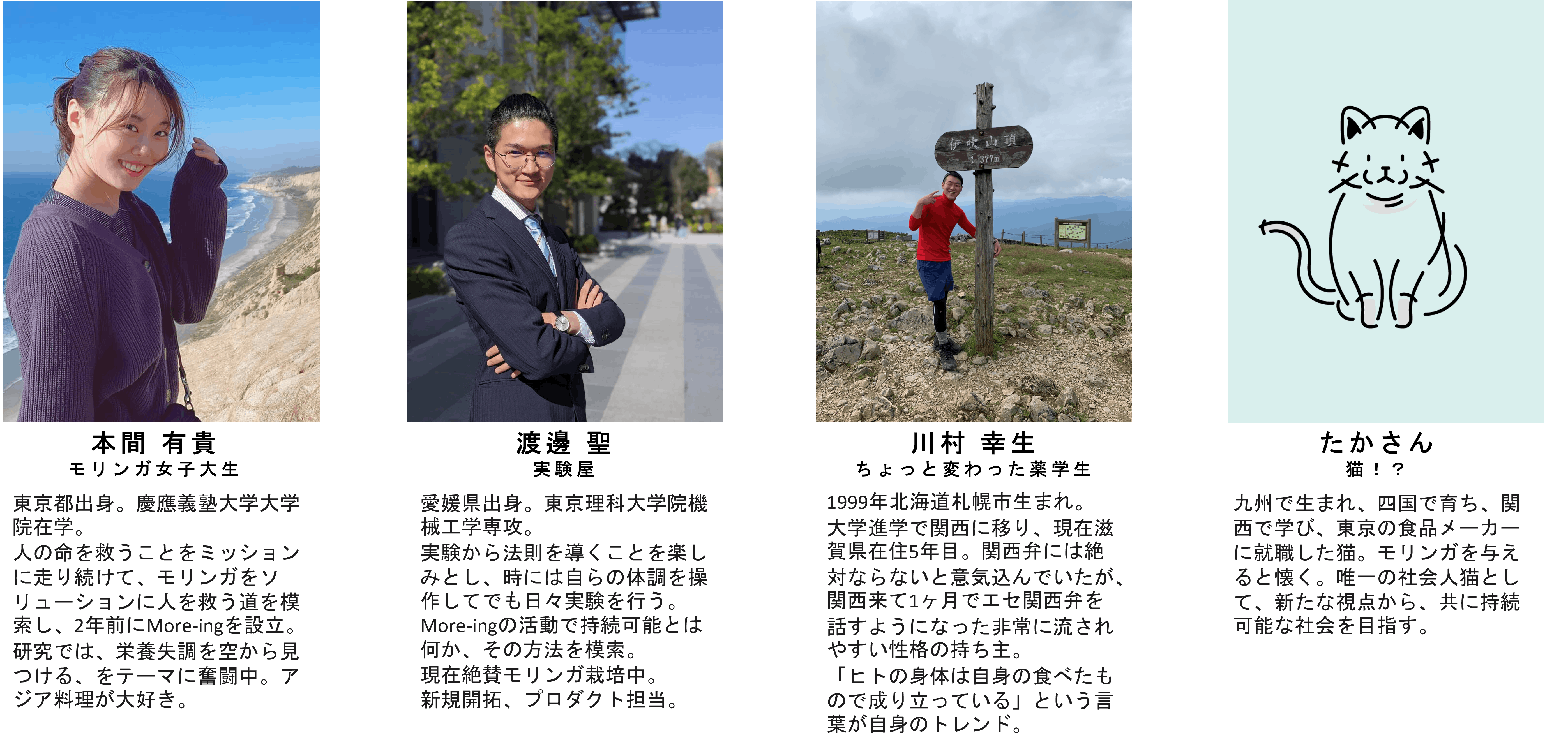 More-ing(モアイング)は、たくさんの世界にある社会課題のなかで、「栄養の状況改善」に重点をおいています。代表者の思いである「若い人の命を持続可能に救う」、この問題を解決する糸口である「奇跡の木」から作る「スーパーフード」。こういった活動が草の根的に広がる、そしてその根源が「日本の若者である」。これを皆で応援しませんか?