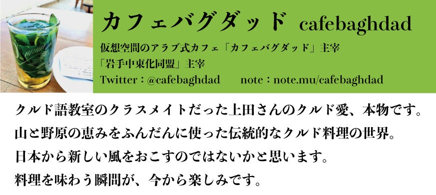 現在は出身地である岩手県に移り、岩手県産の食材を用いて中東料理を作ったり、中東と岩手の食文化の共通点について記事を書いたりと、とても興味深い活動をされています。