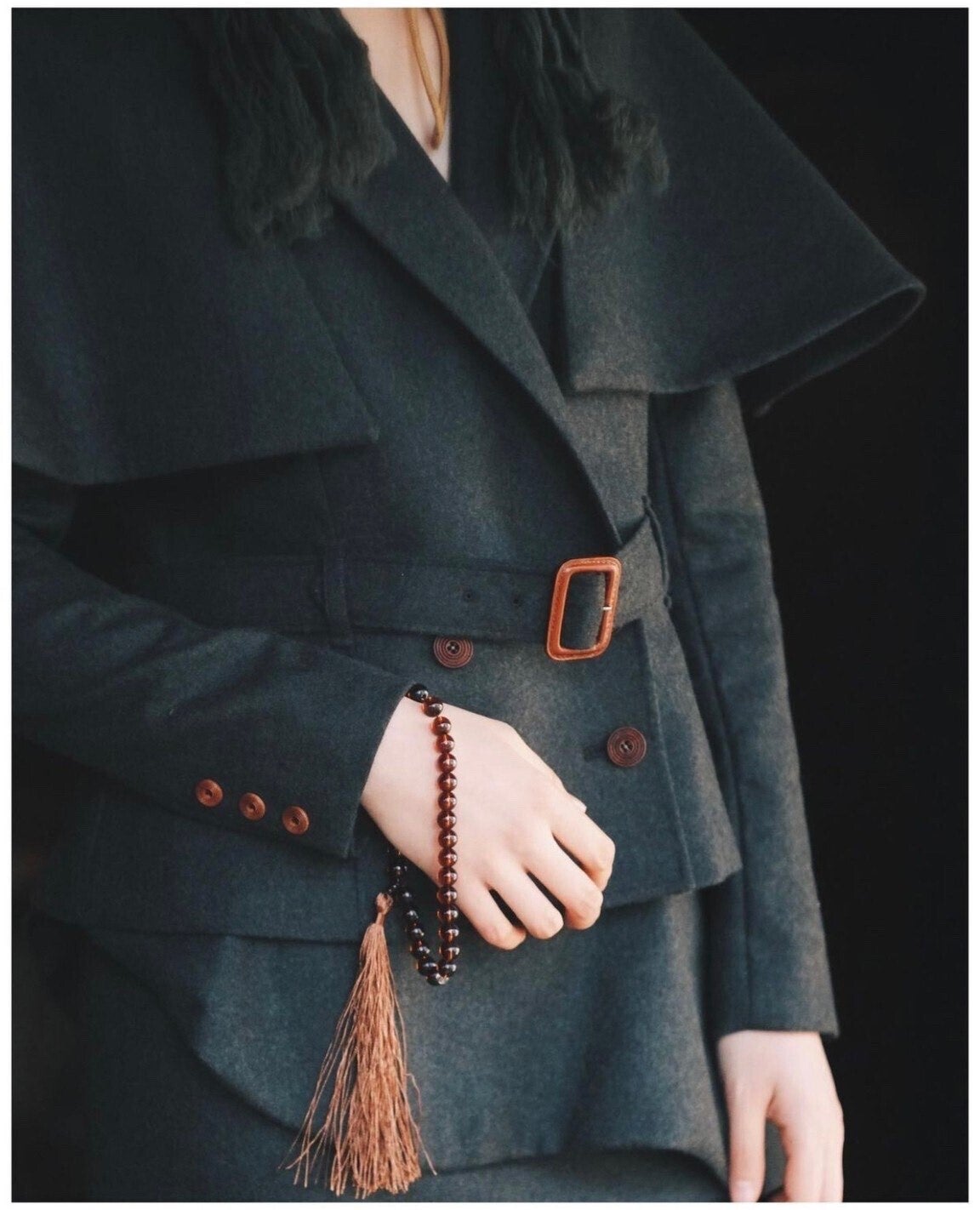 ジャケットはアシンメトリーながら、紐を三つ編みで合わせることによって自然なシルエットを実現した。