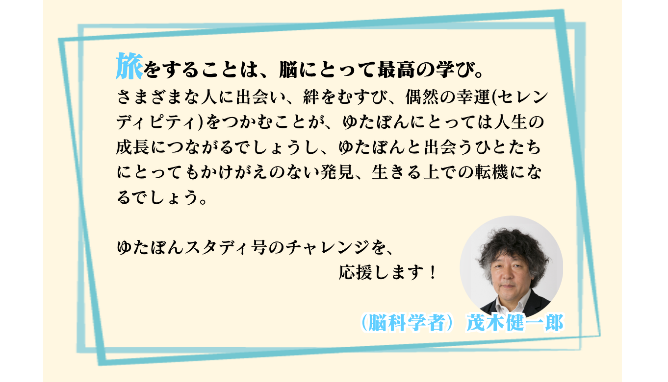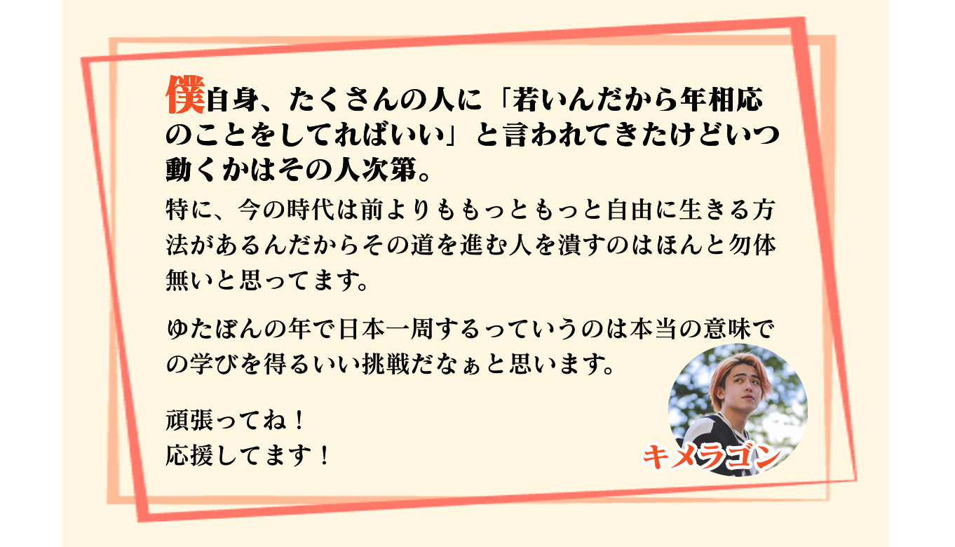 僕はYouTubeやラジオとかの言葉だけじゃなく、自分自身の挑戦でたくさんの人に元気と勇気を与えたいと思っています。今回のゆたぼんスタディ号で日本一周するのも僕にとっての大きな挑戦であり、それを見てくれる人や応援してくれる人にパワーを届けたいと思っています。