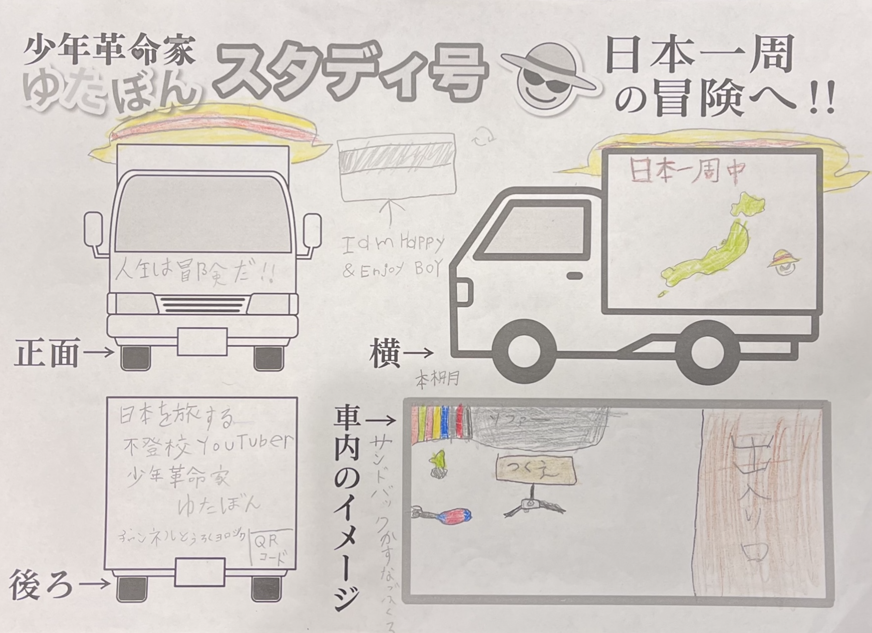 ですが、ただ普通に勉強カーを作るだけだと面白くないので、その勉強カーを「ゆたぼんスタディ号」にして、その車で日本一周して、いろんな人に直接会いに行って元気と勇気を与えたいと思ったのです。