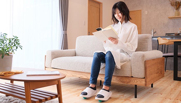 これまでに立ったり歩いたりすることで下肢の筋活動を活性化させ、運動効果を向上させる履物は市場にもありましたが、座ったままで同様の効果が得られる履物は商品化されておりませんでした。